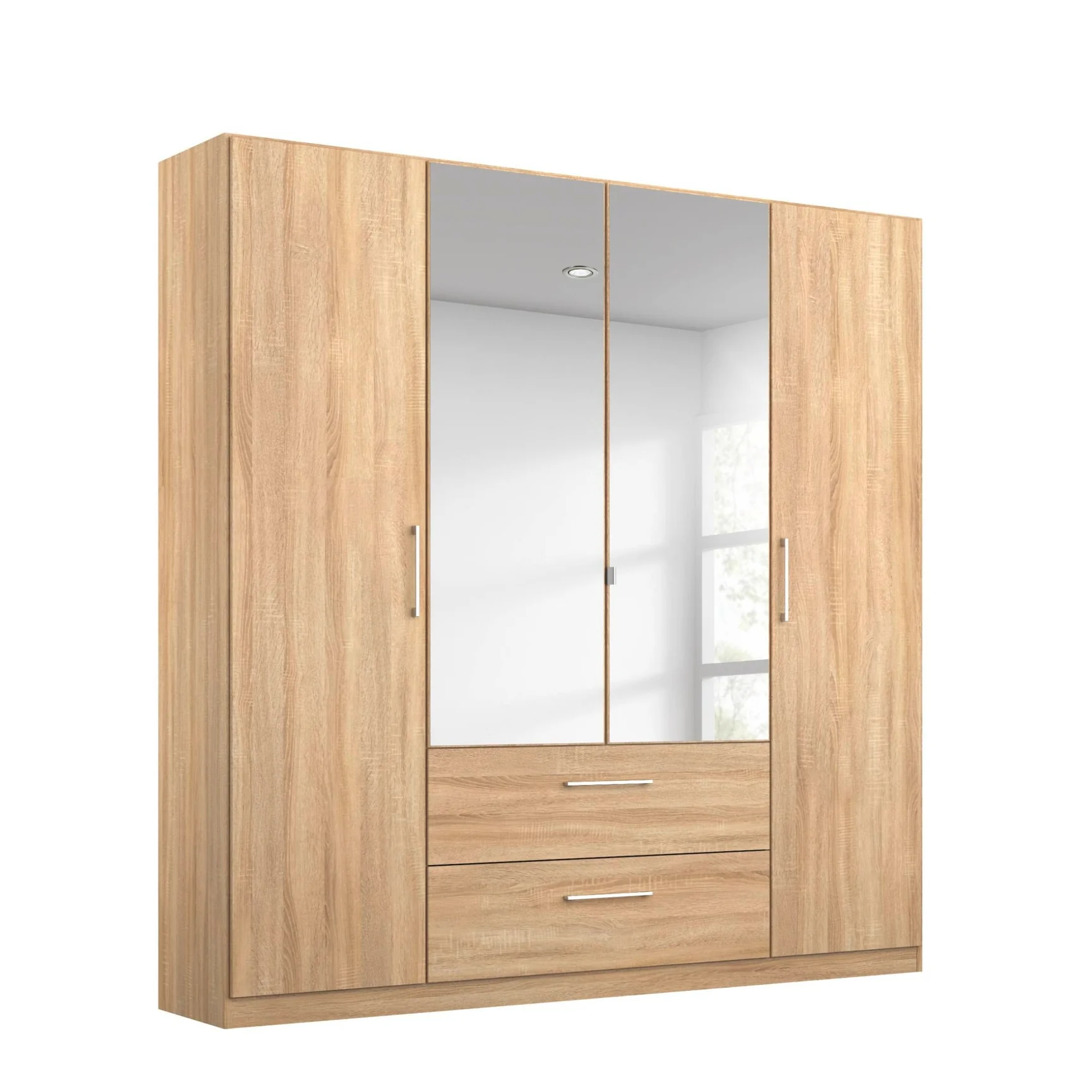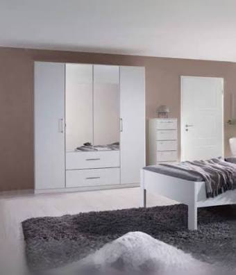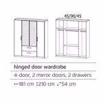 Upgrade your bedroom with the Bolzano Wardrobe. This 4-door wardrobe features 2 mirrored doors, shelves, a hanging rail, and 2 drawers for ample storage. Keep your clothes organized and easily accessible with this stylish and functional wardrobe.