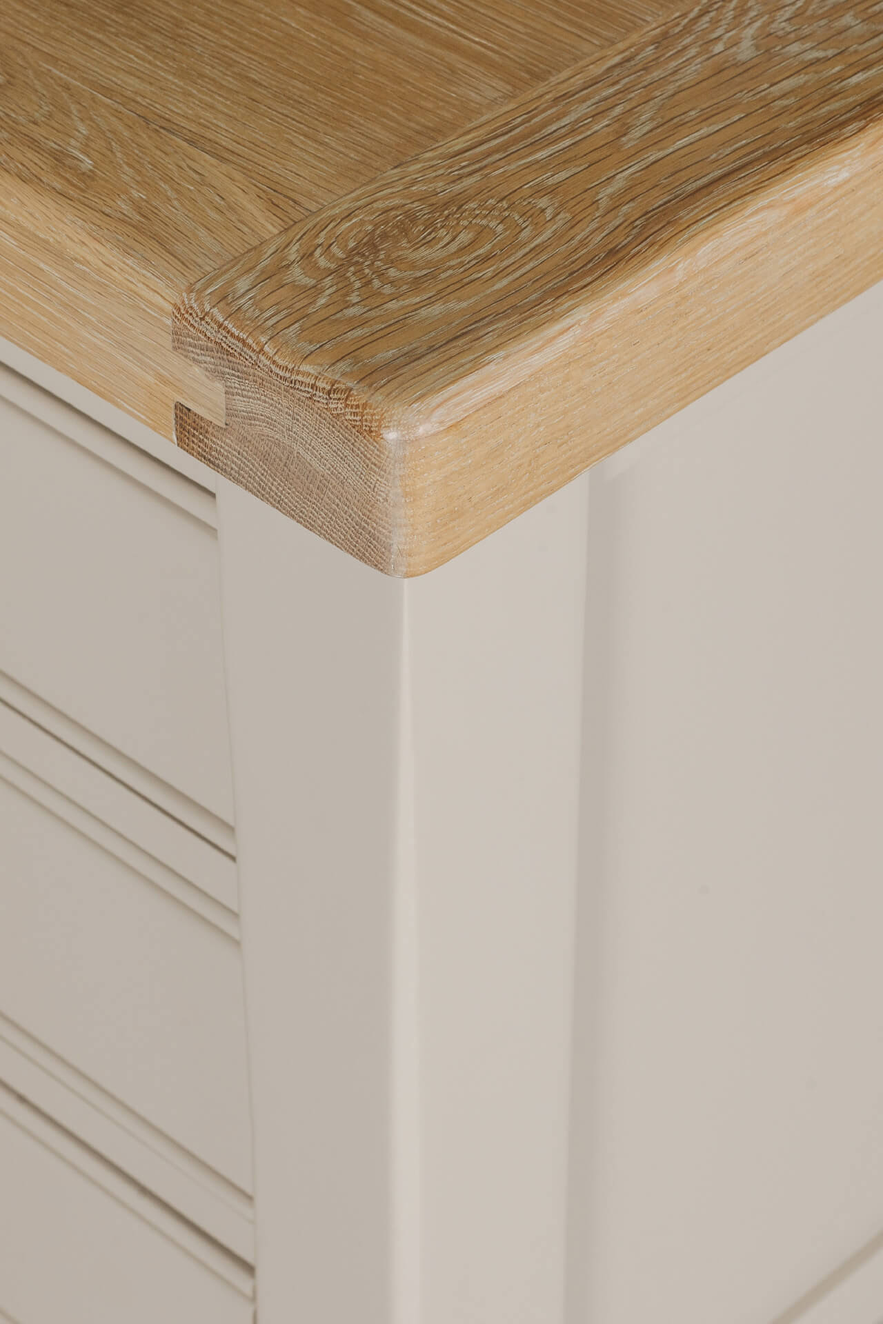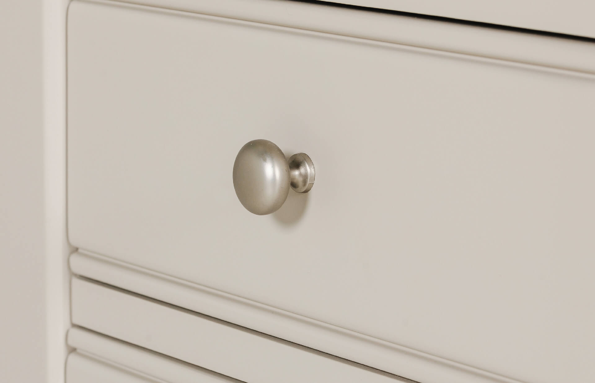 Burgh 3-Drawer Bedside Table in Taupe. This versatile piece features three spacious drawers with sleek metal handles, providing ample storage for your nighttime essentials. The table's painted finish and elegant oak veneer top add a touch of sophistication to any decor.