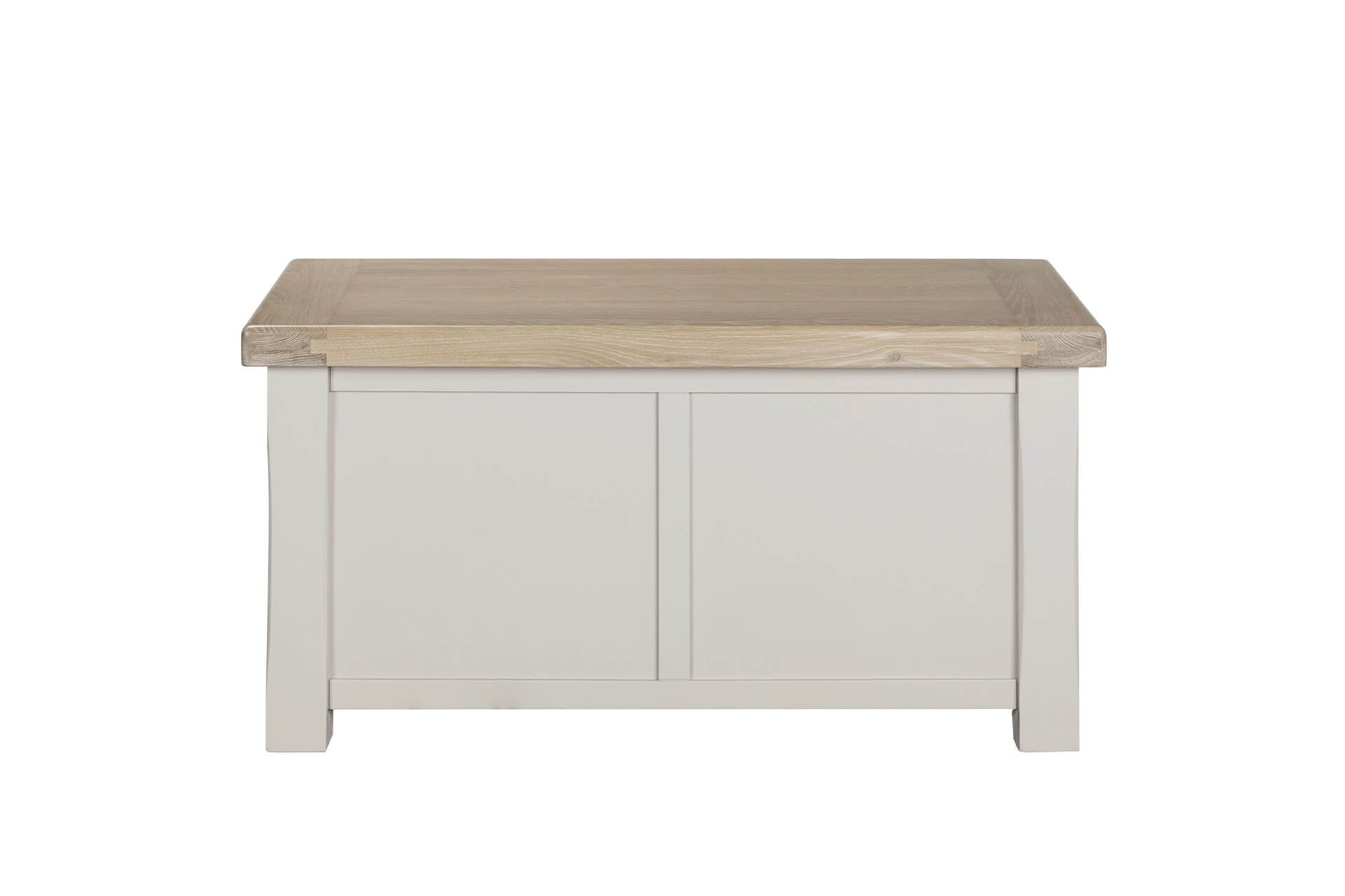 Burgh Blanket Box in Taupe. This versatile design features a painted finish complemented by a chic oak veneer top. The blanket box includes a slow-close mechanism on the lid for smooth and quiet operation. Perfect for storing blankets, linens, or other essentials, the Burgh Blanket Box combines practical storage with timeless style.