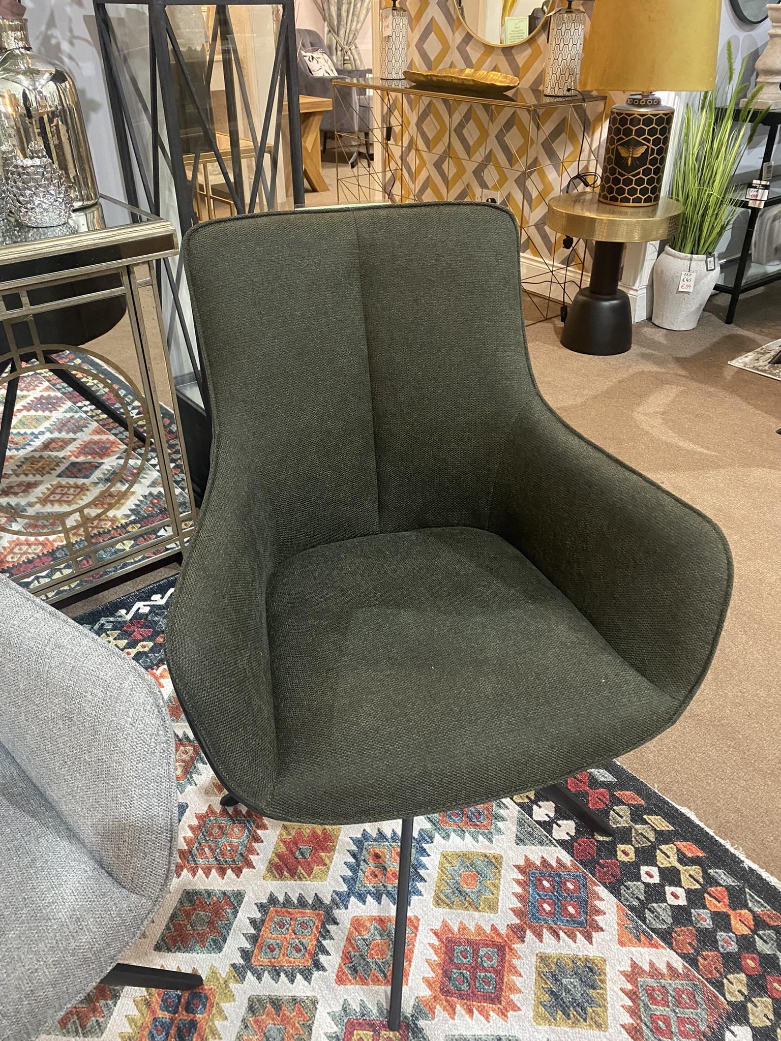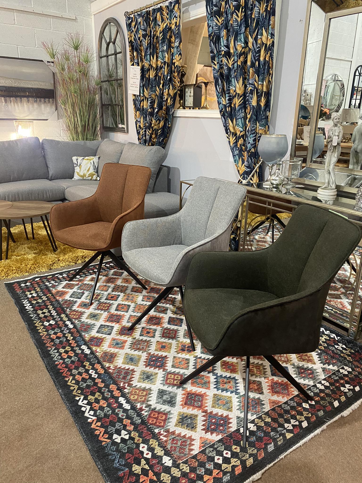 See the incredible Foster Dining Chair. Available in grey, sage green, rust orange and beige colours, the Foster provides beautiful soft touch fabric upholstery with incredible comfort. With it’s increible padded back rest to provide the must luxury expierience, you can be sure this item will be a great fit for any kitchen or dining room. Features black coloured metal legs and swivel motion.