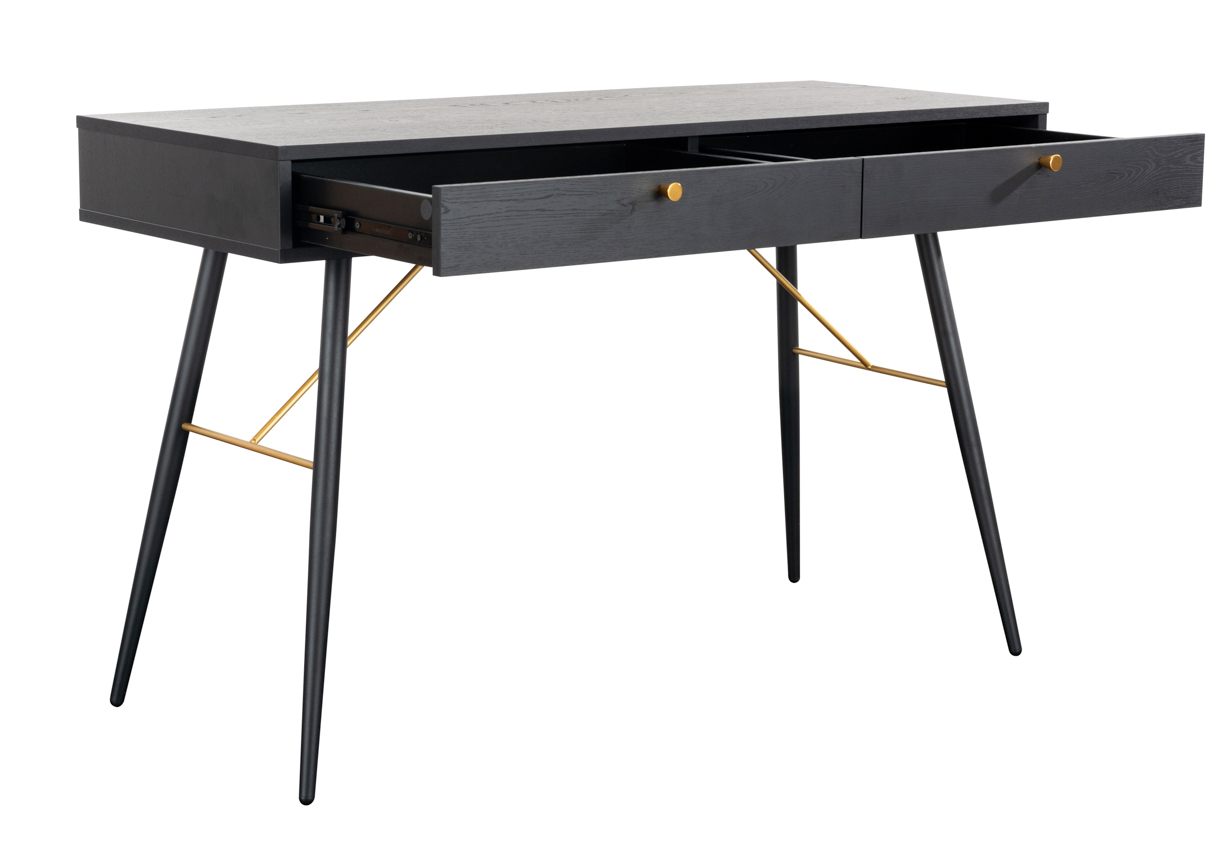 Black oak melamine, powder-coated black metal legs, copper metal accents.