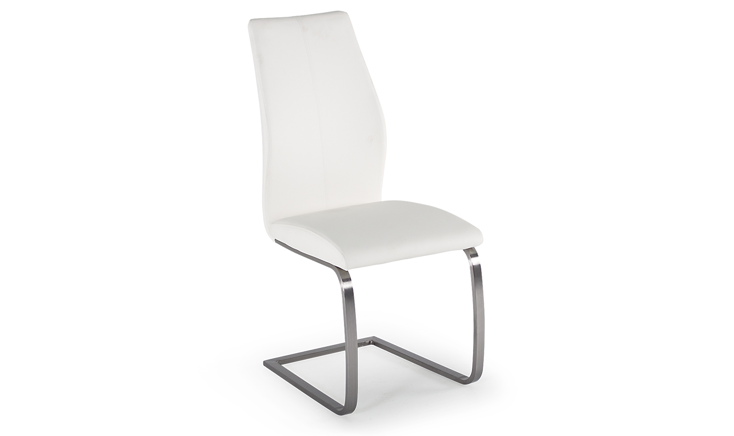 Thurman dining chair is available in 6 different colours. This is a modern styled dining chair that will suit an array of interior spaces. Use in the kitchen or with any dining table for a chic and modern style. Featuring luxurious faux leather upholstery and a sleek brushed stainless steel cantilever frame.